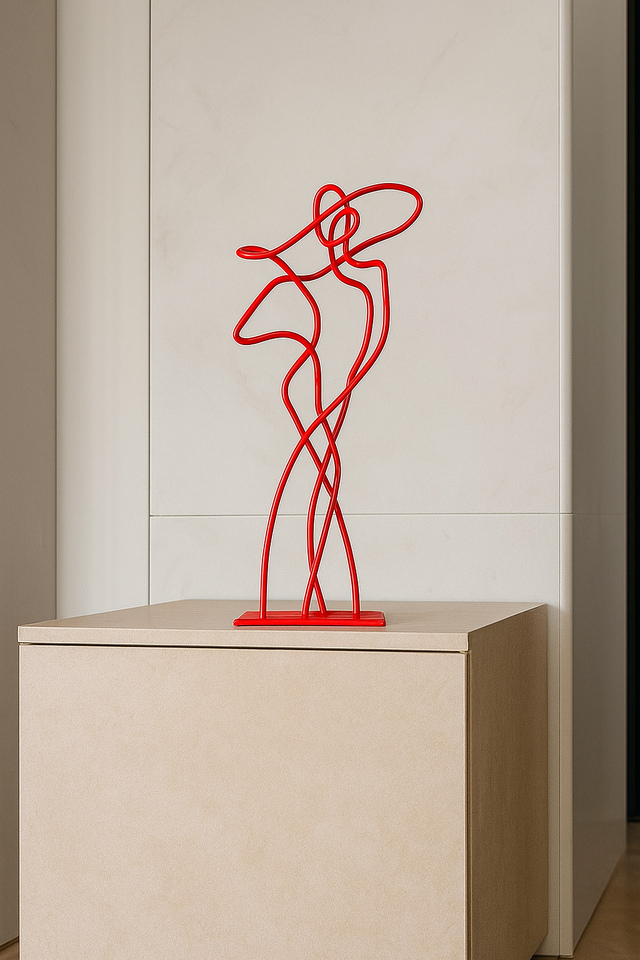 La Diva Rouge est une sculpture raffinée conçue à la main par Rémi PLAULT. Utilisant des tiges de métal, elle représente une silhouette féminine élégante avec un chapeau et la main droite sur la hanche. Peinte en rouge, cette œuvre est idéale pour l'intérieur. Chaque pièce est unique et livrée avec un certificat d'authenticité.