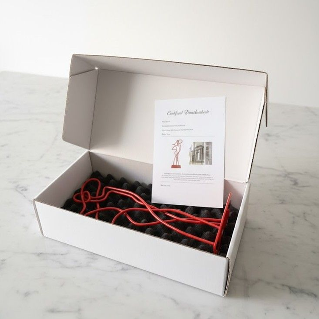 La Diva Rouge est une sculpture raffinée conçue à la main par Rémi PLAULT. Utilisant des tiges de métal, elle représente une silhouette féminine élégante avec un chapeau et la main droite sur la hanche. Peinte en rouge, cette œuvre est idéale pour l'intérieur. Chaque pièce est unique et livrée avec un certificat d'authenticité.